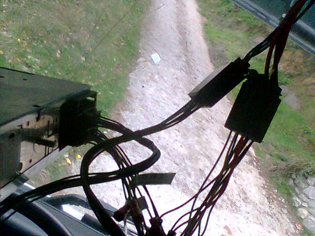 He metido la caja azul arriba a la izquierda, cables del adaptador por detras y por la derecha, cables por debajo, y también arriba pegados con cinta aislante para que me dejen meter la radio. La verdad es que pensé que habría más sitio...