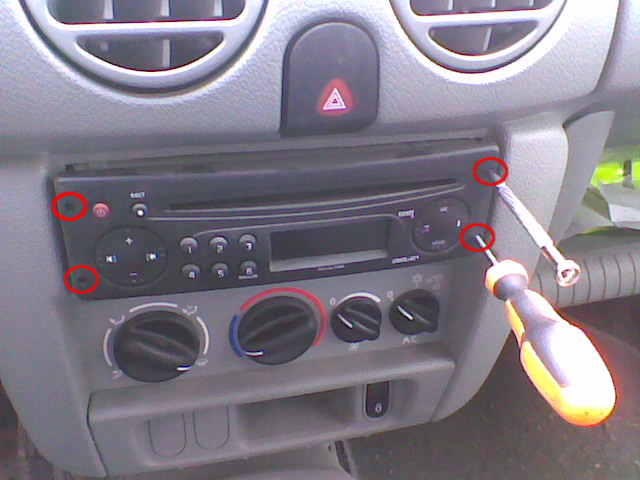 En los cuatro orificios circulares de las esquinas hay que meter algo para que mueva las pestañas y se pueda extraer la radio. Yo tenía 2 destorniladores suficientemente estrechos, saqué primero el lateral izquierdo y luego el derecho.