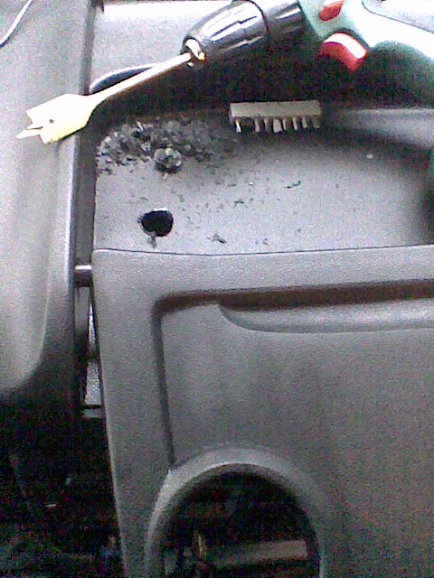 Es más sencillo hacer el agujero fuera del coche, para sacar la pieza solo hay que quitar el conector del cierre centralizado.